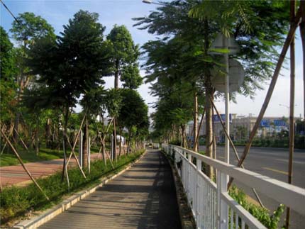 眼前的這條道路開闊大氣、綠色生態(tài),而當初施工時,卻面臨著很多難題。該項目定位較高,工期短,交叉施工嚴重,更經歷了濱海的臺風季節(jié)天氣,所以施工中對施工工序組織、材料組織及機械勞動力的組織顯得尤為重要;由于施工范圍處于交通繁忙的205國道深圳段,對施工現(xiàn)場車輛的疏導及路邊作業(yè)的圍護等的要求都需嚴格把控;為了保證景觀效果,對苗木的要求比較高,很多假植的苗木需要用保鮮的方法長途運載到施工現(xiàn)場進行種植。“施工中面臨的各種不利因素不但增加了工程成本,更加大了施工難度,但在項目部全體人員工的共同努力下,最終克服種種困難,圓滿完成了任務,展現(xiàn)了杭州市園林綠化工程有限公司優(yōu)質高效、創(chuàng)新進取的企業(yè)形象,受到各方的一致好評。”徐向明的一番簡短話語,卻讓我們感受到了施工期間的諸多辛苦。