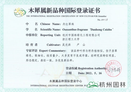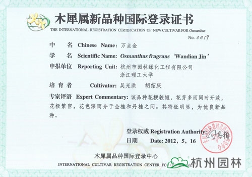 近日,由杭州市園林綠化工程有限公司與浙江理工大學(xué)聯(lián)合研發(fā)的“丹紅翠珠”、“杭州丹桂”、“杭州黃”、“菊瓣”、“萬(wàn)點(diǎn)金”5個(gè)桂花新品種獲得木犀屬新品種國(guó)際登錄證書(shū)。截止目前,杭州園林已經(jīng)有12個(gè)桂花品種獲得此項(xiàng)國(guó)際登錄權(quán),充分展示了企業(yè)在桂花研究方面的突出成績(jī)。