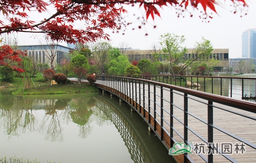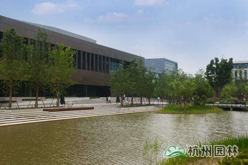 從濱江區(qū)江虹路的西入口處走進(jìn)華為杭州生產(chǎn)基地,首先映入眼簾的是廣場上大小不一的花池,一棵棵銀杏、香樟、桂花生長得郁郁蔥蔥,昭示著無限的生機與活力。腳下的鋪裝,一邊是菠蘿格防腐木,一邊是規(guī)則的花崗巖,一“軟”一“硬”,相映成趣,蜿蜒延伸,直通前方的人工湖。清澈的湖水,在夏日陽光的照耀下,波光粼粼,偶爾一陣風(fēng)來,一圈圈的漣漪蕩漾,整個湖面都動了起來,讓人忍不住加快腳步,去一睹前方的美景。這就是華為杭州二期生產(chǎn)基地景觀綠化分包工程一標(biāo)段的現(xiàn)場景觀,該工程由杭州市園林綠化股份有限公司承建,曾榮獲2013年度浙江省園林綠化工程安全文明施工標(biāo)化工地。