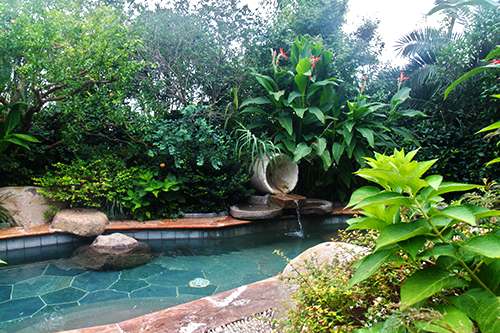 露天泳池熱帶風情,溫泉泡池仿若天成。露天泳池區景觀獨具特色,選用華棕、棕櫚、布迪椰子、加拿利海棗等熱帶植物作為主景,營造出簡約大方、層次分明的濃郁熱帶園林風情。為了提高這些熱帶植物的成活率,降低后期的養護成本,這批植物都經過馴化,較能適應吳江的氣候條件。該區面積較大,從酒店的觀景平臺上往下看,泳池中間的小島就像彎彎的小船,仿佛要順流而下;水質清澈見底,水底大面積的藍色和黃色玻璃馬賽克,營造出波光鱗鱗的效果,流動的線條瞬間充滿了生機和活力,整個泳池仿佛都動了起來。