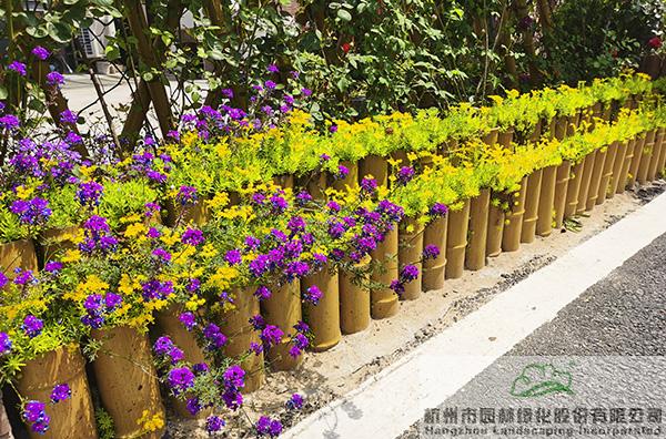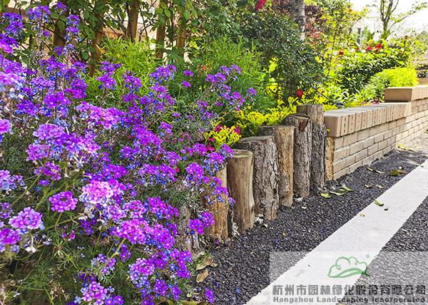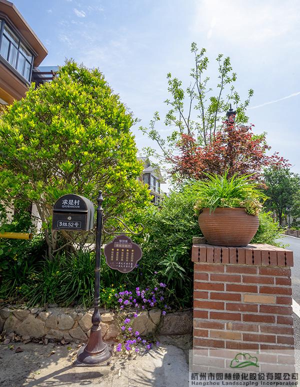 景墻邊的植物配置同樣有講究。利用銀杏、桂花、梅花、紅楓等植物營造上層空間,這些植物具有遮擋作用,能夠為庭院營造一定的私密空間。通過樹狀、球狀、攀援、傘狀、字母等各種形態的月季,金冠女貞球、龜甲冬青球、銀姬小蠟球、藍莓、八仙花、小葉梔子、翠蘆莉、花葉千鳥花、藍山鼠尾草、紫葉狼尾草等小喬灌木,在打造中層空間的同時,和美女櫻、金娃娃萱草、花葉玉蟬花、花葉香桃木、紫菀、澤蘭、礬根、五彩絡石、石竹等下層空間植物一起,裝飾和襯托景墻,使家家戶戶的景觀更加豐富多變。