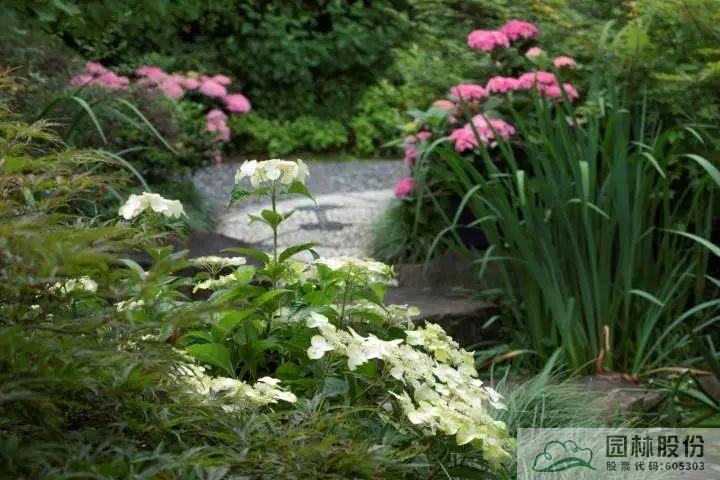 ▲園林股份自主選育的‘青山’系列繡球在畫境·青山湖花園中心室外景觀展示區中的應用
